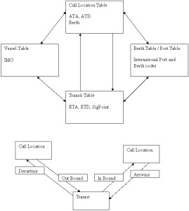 The above diagram represents a method of generating a transit and call history that is flexible and voyage independant. It allows for the acknowledgement of a vessels passage across significant points, used in many harbors as voyage locations If further allows for a database structure that can apply local table sets to the Vessel, Berth, Call and Transit records (not illustrated). The system does away with “explicit” linkages that use key contextual data (such as location and date to identify a transit to a port). Rather it uses an abstracted linkage that allows fot any transit to be attached to any call. In this way a the record ID is stored in recipicol links between the Transit and CallLocation fields. This association allows for the vessels to have a linked voyage history that can handle estimated as well as actual movements with great ease, as well as handling inserted or dropped Calls without having to re-asses the complete list.